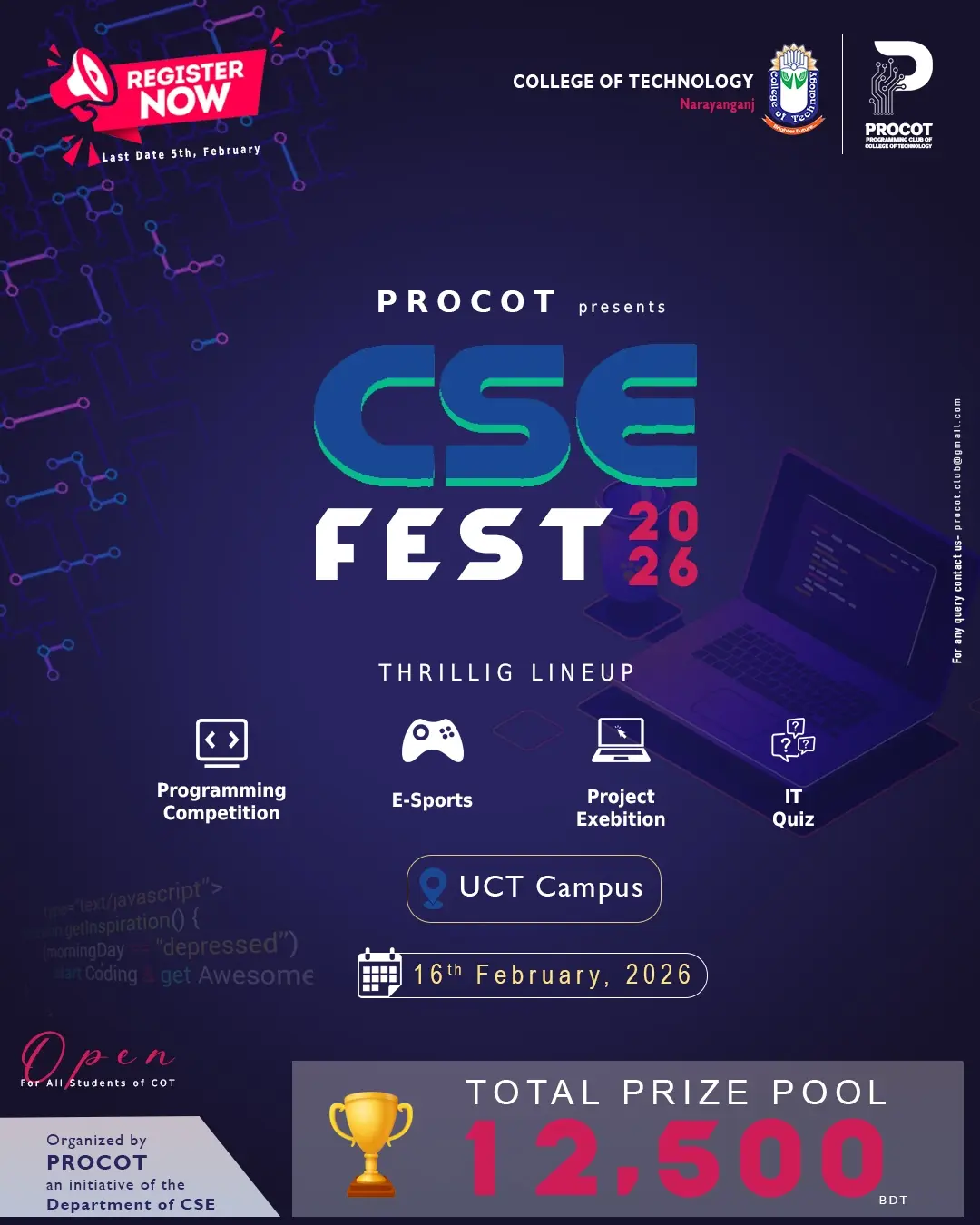 College of Technology is a non-profitable and non-political educational institution. College of Technology is devoted to excellence in teaching, learning, and research, and to developing leaders in many disciplines who make a difference nationally and globally. The University, which is based in Narayanganj, has an enrolment of over 1,000 degree candidates, including undergraduate, graduate, and professional students. Furthermore College of Technology is privately tutored institution and the certificate is provided by the National University of Bangladesh. First Stublished in 1997, later Swifted to Narayanganj in 2010.
